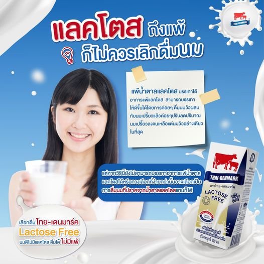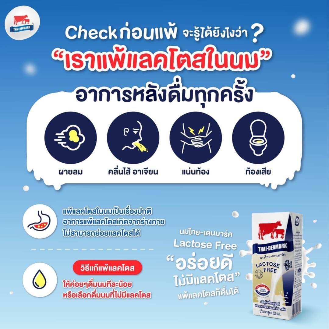 "หรือเพียงแค่เลือกดื่มนม Lactose Free แทนก็ทำให้ได้ประโยชน์เช่นกัน เพราะนมไทย-เดนมาร์ค Lactose Free ผลิตจากน้ำนมโคแท้ 100% ไม่มีส่วนผสมของนมผง ที่ผ่านกระบวนการย่อยด้วยเอนไซม์แลคเตส ทำให้น้ำตาลแลคโตสในนมหมดไป กลายเป็นน้ำตาลที่มีขนาดโมเลกุลเล็กลง คือ น้ำตาลกลูโคส และน้ำตาลกาแลคโตส ซึ่งเป็นน้ำตาลที่ย่อยง่าย สบายท้อง ดูดซึมไปใช้ได้ทันที"
