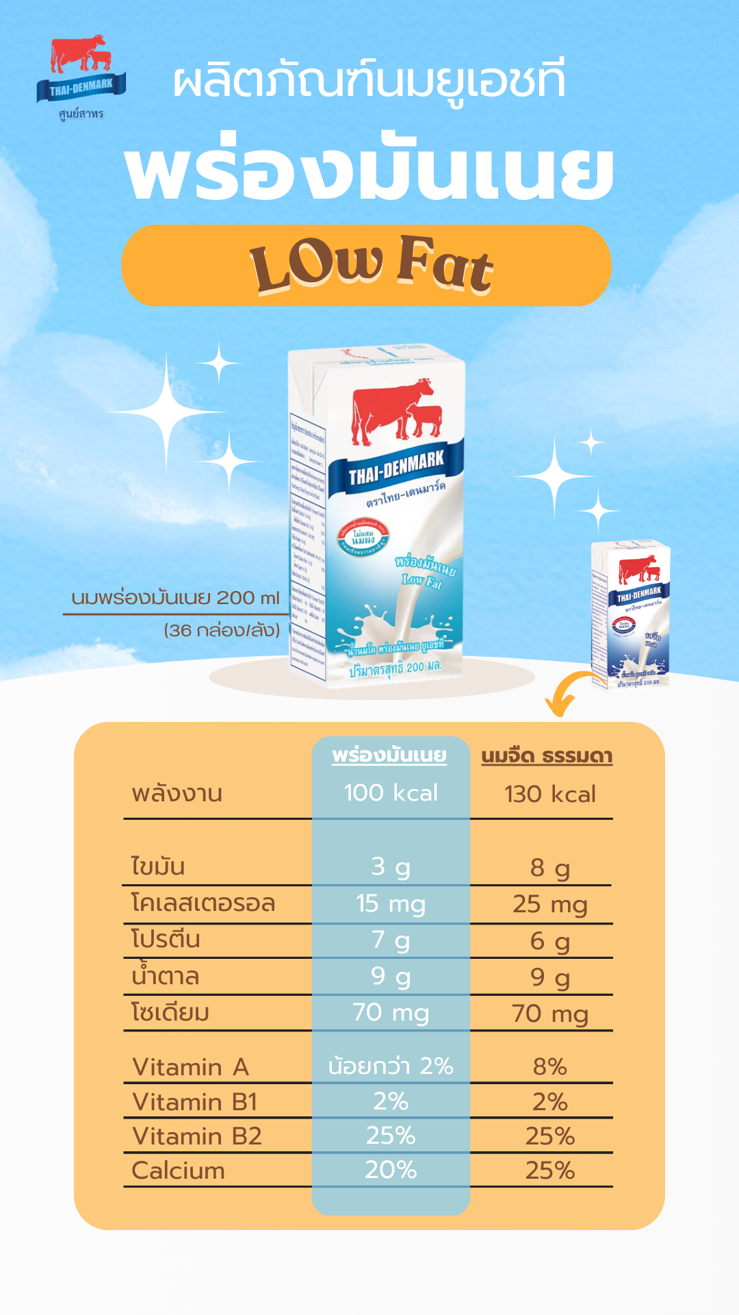 นมไทย-เดนมาร์ค พร่องมันเนย ผลิตจากน้ำนมโคสดแท้ 100% ไม่ผสมนมผง และถึงแม้จะสกัดเอาไขมันออก แต่คุณค่าทางโภชนาการและวิตามินก็ยังคงอยู่เต็มๆ กล่อง